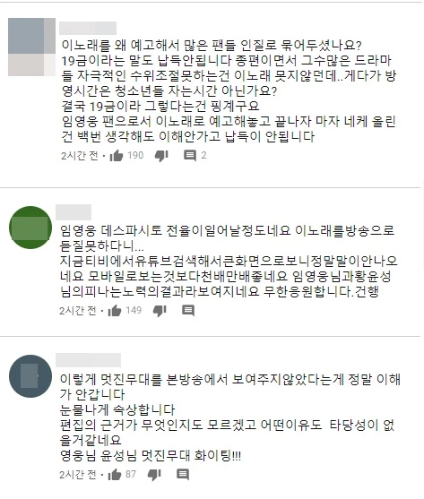 당초 이 무대는 '사랑의 콜센타' 예고 영상에 포함돼 팬들의 기대감을 자아냈다. 임영웅 씨는 지난해 '데스파시토' 커버 영상을 자신의 채널에 게재해 242만 조회수를 이끌어내는 등 인기를 끌었다. 시청자들은 제작진이 임영웅 씨가 부르는 노래를 선곡한 데에 영향을 끼쳤을 것인데 정작 방송에는 드러나지 않자 불만을 토했다.