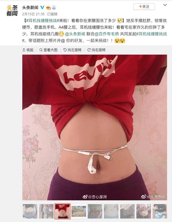 코로나19 사태 때문에 실내에 머물 때가 많은 중국 누리꾼들이 만들어낸 놀이로 보인다. 중국 누리꾼들은 길이가 1.4m인 애플 제품을 비롯해 여러 이어폰을 동원해 늘씬한 자기 몸매를 과시하고 있다.