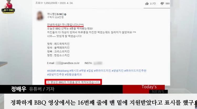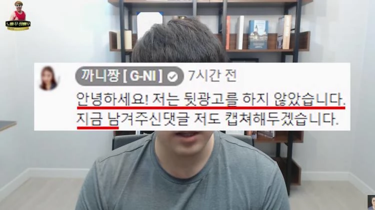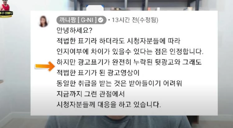 정배우는 "까니짱 주장에 따르면 더보기란 몇 번째 줄에 광고 표기를 했다는 식이다. 말장난하는 것도 아니고 이게 표시를 한 거냐. 이런 논리면 100번째 줄에 써놨어도 광고 표시 한 거다"라고 비난했다.