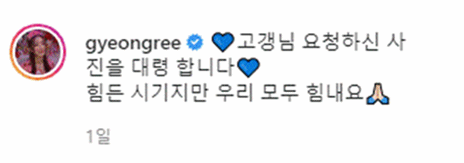 경리는 이날 자신의 인스타그램에 "고객님 요청하신 사진을 대령합니다"라는 글과 함께 여러 장의 사진을 올렸다. 더불어 "힘든 시기지만 우리 모두 힘내요"라며 최근 재확산된 코로나19로 힘든 시기를 보내고 있는 팬 분들을 응원했다.