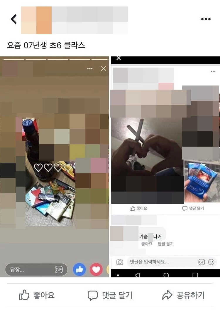 여러 초등학생이 집, 노래방 등에 모여 술을 앞에 쌓아놓고 포즈를 취하고 있다. 두 명의 학생이 손가락에 각자 담배를 끼우고 하트 모양을 한 사진도 있다.