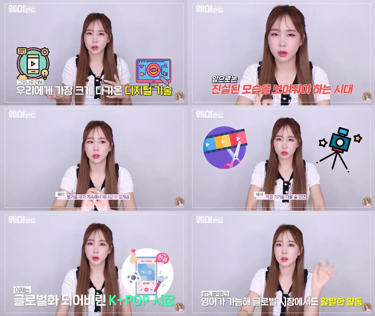 웨이는 코로나19로 인한 사회적 거리 두기로 인해 점점 AI시대가 되면서 "상품화된 아이돌이 아닌 진짜 인간미가 소중해질 거라고 생각한다"며 "요즘 연예인들이 유튜브를 많이 하는 이유도 그런 것 같다"고 말했다.