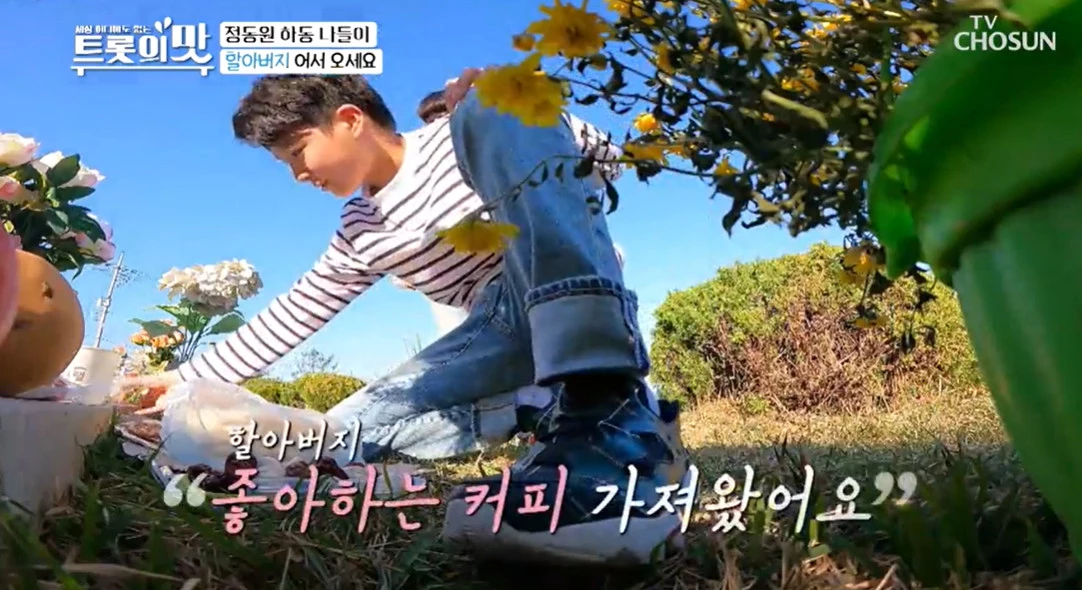 정동원은 슬픔을 꾹 참으며 할아버지에게 말을 건넸다. 그는 "할아버지 좋아하는 커피 한잔 드릴게요"라며 산소에 커피를 부었다. 이어 조심스럽게 잡풀도 뽑았다.