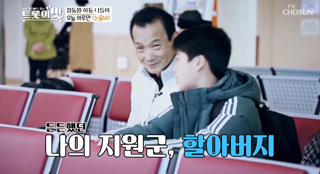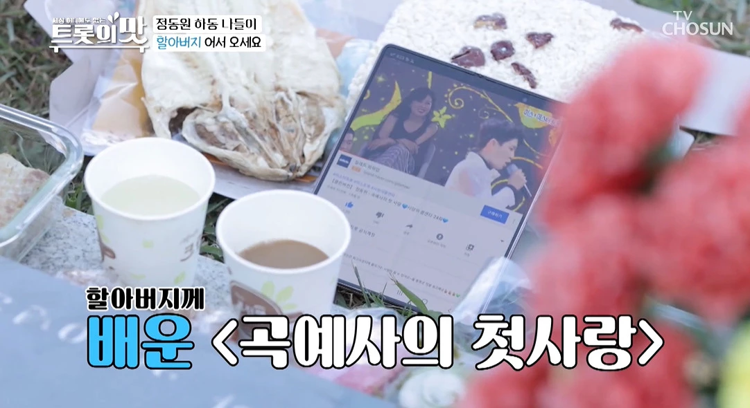 정동원은 할아버지가 가장 좋아하시던 노래도 들려드렸다. 정동원이 가수 홍진영의 '눈물비'를 직접 부른 영상이 휴대전화에서 흘러나왔다. 원래 할아버지 생각에 일부러 잘 안 하던 노래다.