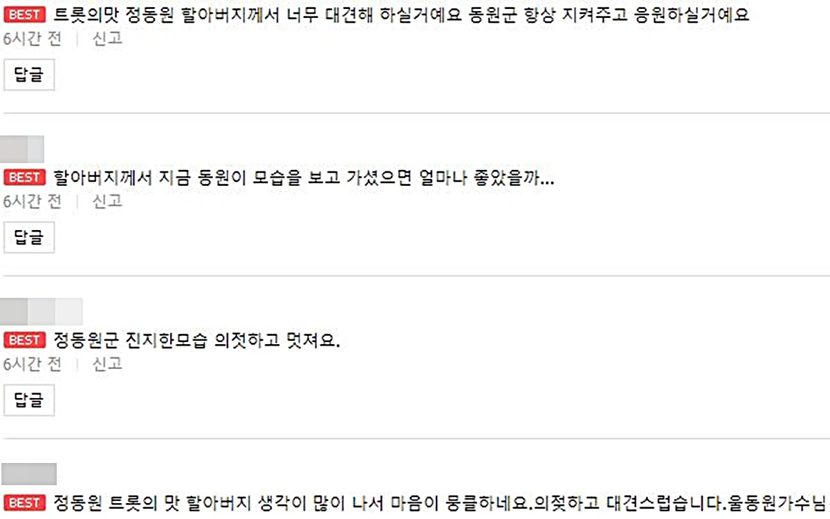 생전 손자의 가장 든든한 지원군이었다던 할아버지는 지난 1월 폐암으로 세상을 떠났다. 정동원은 '미스터트롯'에 처음 나왔을 때 "제가 TV에 나온 모습을 할아버지께 꼭 보여드리고 싶었다"며 눈물 어린 고백을 한 적이 있다.