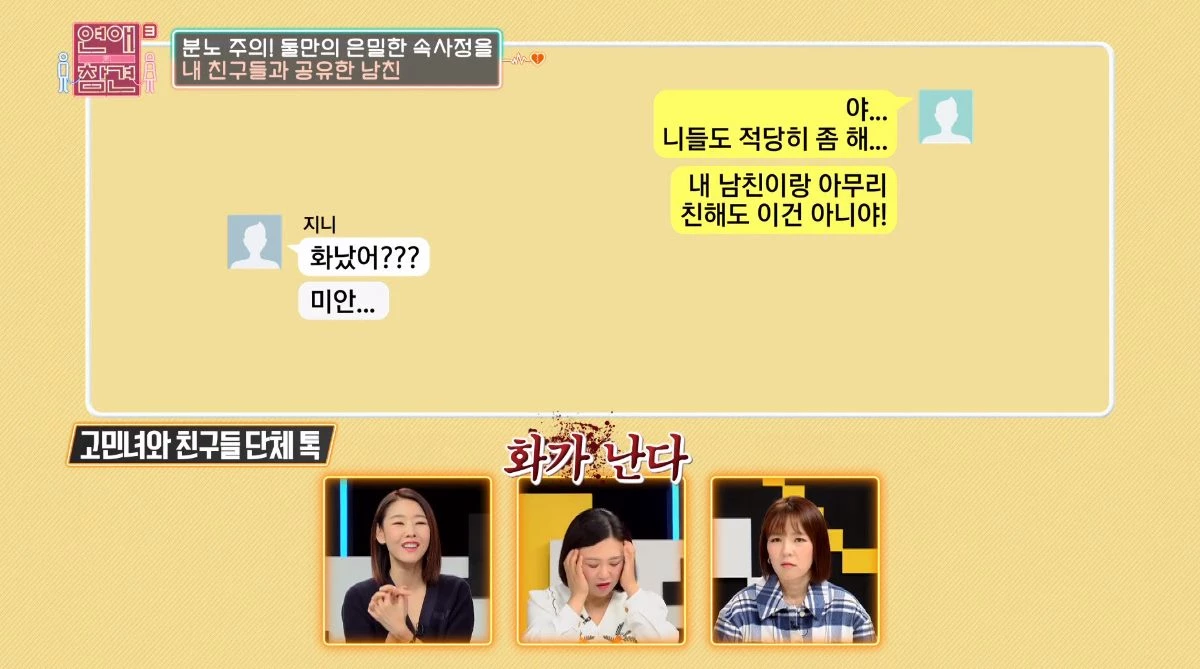 남친이 본인의 친구들과 친해지면서 둘만의 사생활을 공유하자 여친은 분노했다.