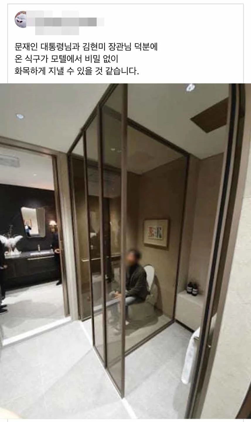 한 누리꾼은 최근 자신의 페이스북에 “문재인 대통령님과 김현미 장관님 덕분에 온 식구가 모텔에서 비밀 없이 화목하게 지낼 수 있을 것 같습니다”란 글과 함께 한 남성이 모텔 투명 화장실의 변기에 앉아 있는 모습을 담은 사진을 올렸다. 모텔이나 호텔을 개조해 집을 공급하겠다는 정부의 방침을 사진 한 장으로 비꼰 것이다.