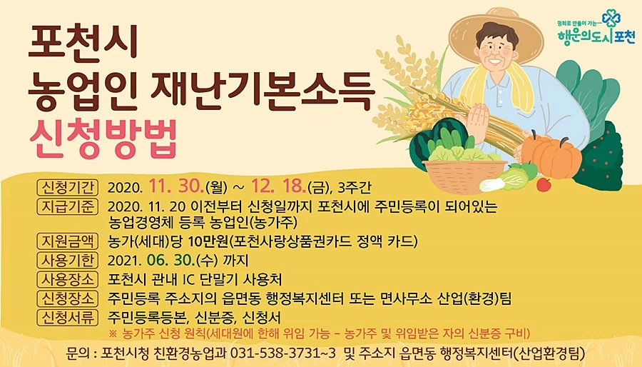 이러한 어려움을 겪고 있는 농민들에게 작지만 조금이라도 도움이 될 수 있도록 9,475농가에 세대당 10만원씩 지역화폐로 재난기본소득을 지급하기로 하였습니다.
