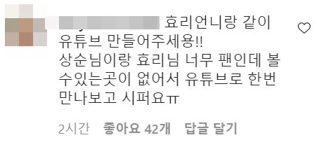 팬들은 "귀엽다"면서도 더 많은 일상을 공유해달라고 했다. 한 팬은 "효리 언니랑 같이 유튜브 만들어주세요!"라고 댓글을 달아 기대감을 높였다. 이 댓글은 '좋아요' 42개를 받았다.