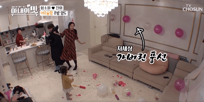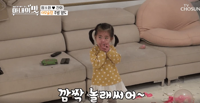 혜정 양은 거실에 붙여놓은 풍선이 터지자 "깜짝 놀랐어"라며 같은 공간에 있었던 진화와 함소원을 뒤로하고 주방에 있던 시터이모에게 달려가 놀란 마음을 진정시켰다.