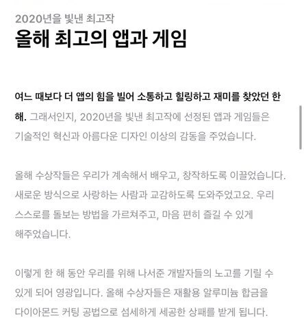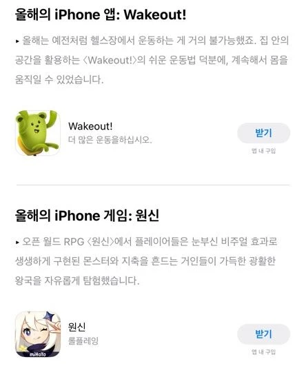 반면 올해 아이폰 게임의 경우 표절 논란이 빚어지기도 했던 '원신'이 받았다. 애플은 "플레이어들은 눈부신 비주얼 효과로 생생하게 구현된 몬스터와 지축을 흔드는 거인들이 가득한 광활한 왕국을 자유롭게 탐험했다"라고 평가했다.