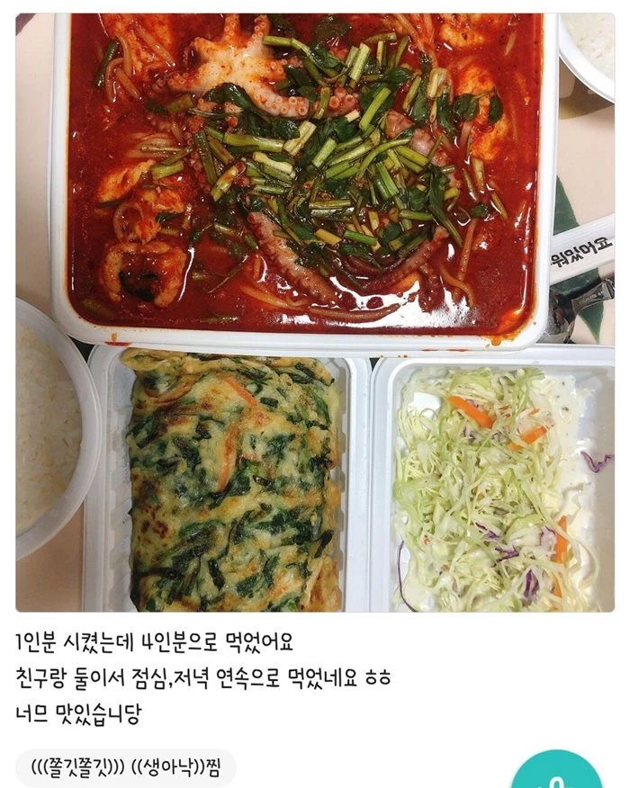 작성자가 올린 사진 속에서는 1인분이라고는 믿을 수 없을 정도로 엄청난 양을 자랑하는 아귀찜을 확인할 수 있다.