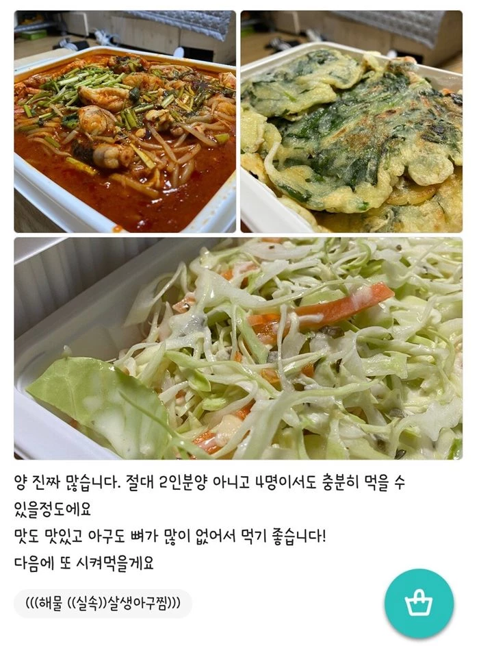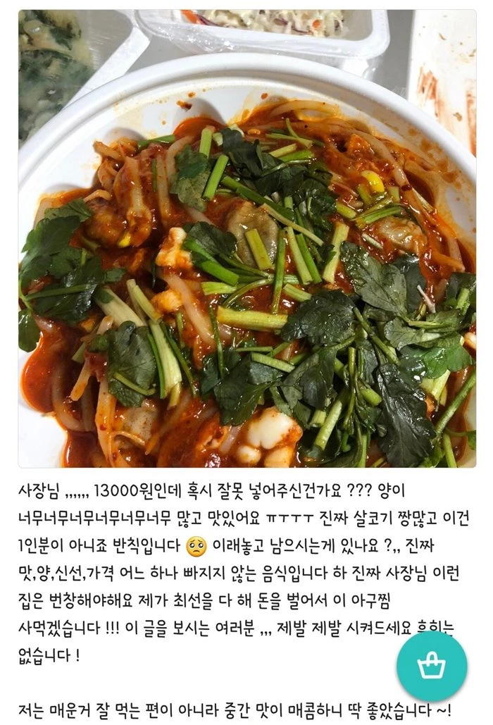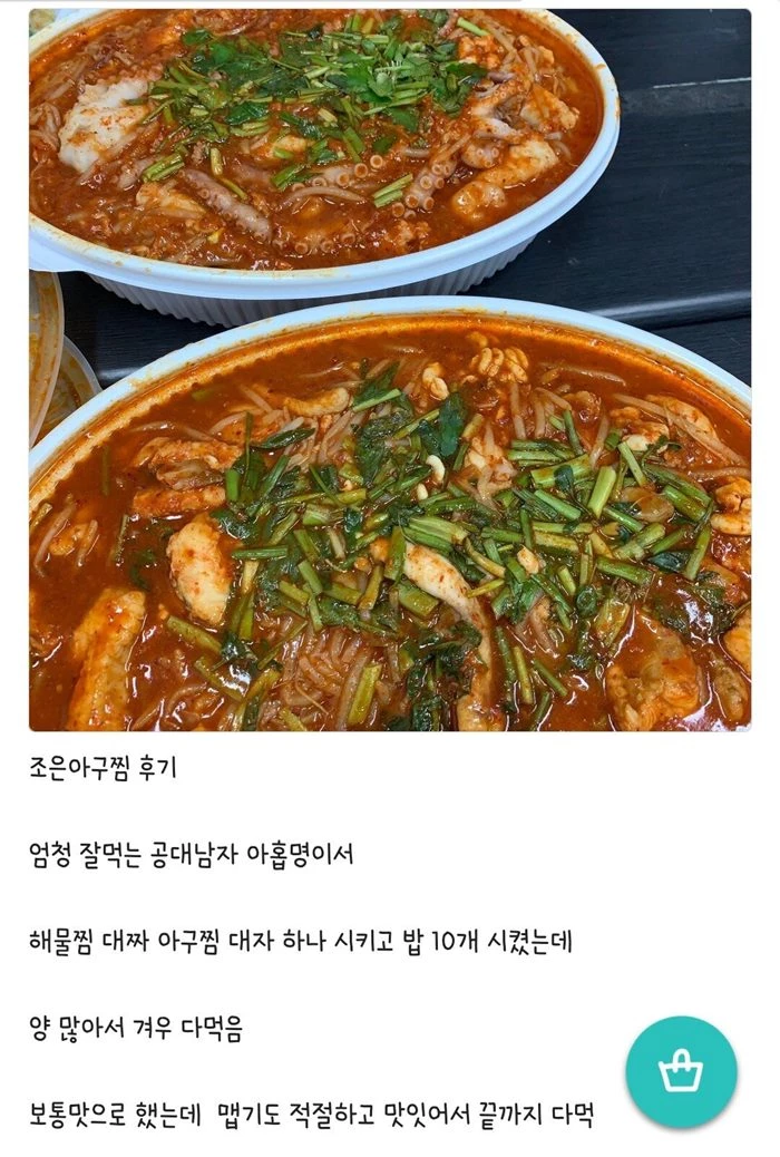 해당 게시물은 부산대학교 에브리타임에 올라온 글을 캡처한 것이다. 글 작성자는 아귀찜 사진과 함께 "1이게 1인분인데 13000원에 전이랑 샐러드 같이 온다"며 "배달해주시는 분 항상 친절하시고 사장님 세심하시고"라고 적었다.