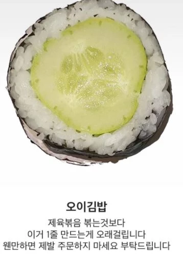사장은 오이 김밥 설명란에 "제육볶음 볶는 것보다 이거 1줄 만드는 게 오래 걸린다. 웬만하면 제발 주문하지 말라 부탁드린다"고 적었다.