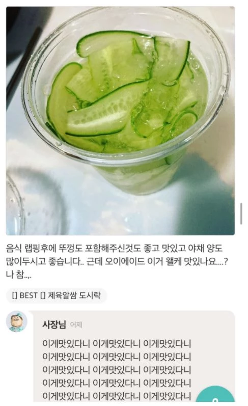 오이 에이드를 시킨 손님이 "음식 랩핑 후에 뚜껑 포함해주는 것도 좋다. 맛있고 야채 양도 많이 주고 좋다. 이거 왜 이렇게 맛있냐?"고 남기자 사장은 "이게 맛있다니"라며 당황해했다.