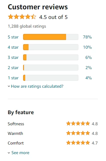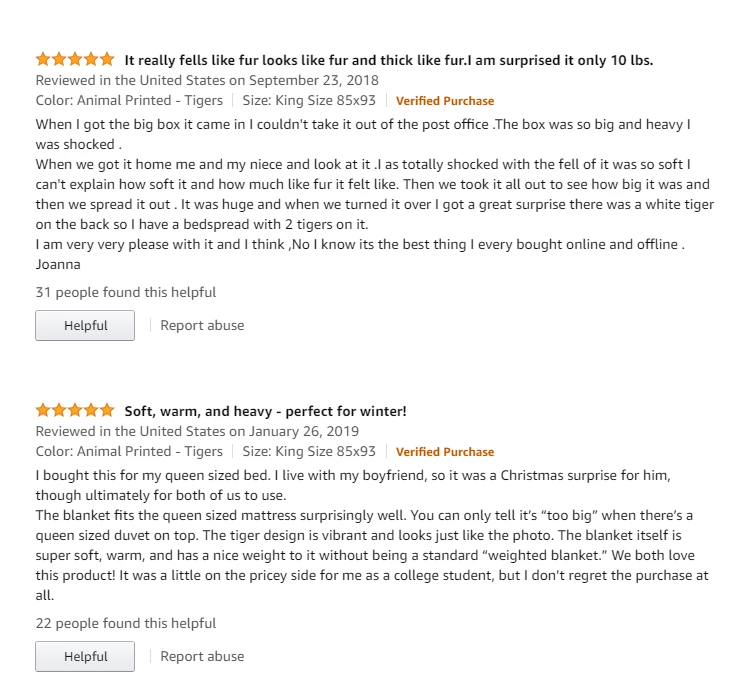 구매자들이 후기에 남긴 평균 리뷰만 봐도 이 이불에 대한 미국인들의 만족도가 높다는 것을 알 수 있다. 구매자 중 80%에 가까운 사람들이 최고 점수인 ‘별 다섯개’를 줬다. 세부 항목을 봐도 5점 만점에 ‘부드러움’이 4.8점, ‘따뜻함’이 4.8점, ‘편안함’이 4.7점으로 매겨져 있다. 호랑이 이불의 따뜻하고 부드러운 품질이 미국인들의 마음을 사로잡은 것이다.