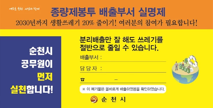 순천시의 산하 부서와 읍면동 행정복지센터에서는 사무실에서 발생하는 생활쓰레기 배출 시 종량제 봉투 앞면에 부서명을 기재한 스티커를 부착한 뒤 쓰레기를 내놓아야 한다.