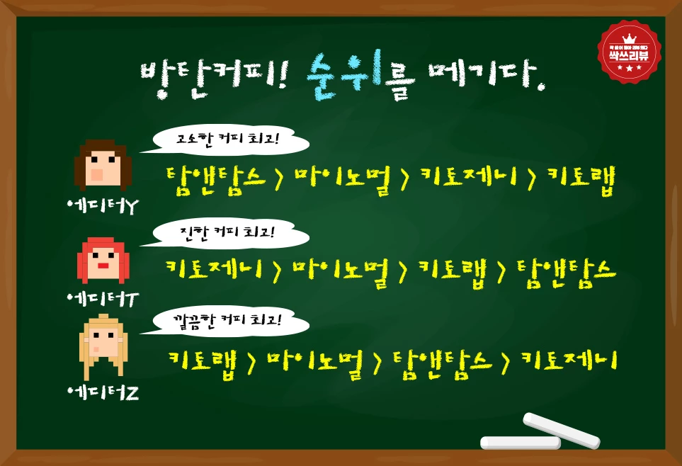 마지막으로 공정한 맛 평가를 위해 입맛 취향 다른 3명의 에디터가 각자 매긴 순위를 공개한다. 평소 즐겨 마시는 커피에 따라 1위 픽 제품은 탐앤탐스, 키토제니, 키토랩 3개 브랜드로 제각각이었다. 그런데 2순위는 모두 마이노멀을 택했다.