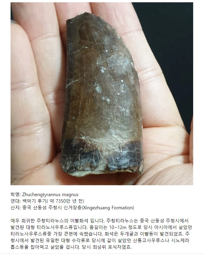 그는 "매우 희귀한 주청티라누스의 이빨 화석이다"라며 "몸 길이는 10~12m 정도로 당시 아시아에서 살았던 티라노사우루스류중 가장 큰 편에 속했다. 화석은 두개골과 이빨 등이 발견됐다. 주청시에서 발견된 유일한 대형 수각류로 당시에 같이 살았던 산퉁고사우루스나 시노케라톱스등을 잡아먹고 살았을 것이다. 당시 최상위 포식자였다"라면서 설명을 이어갔다.