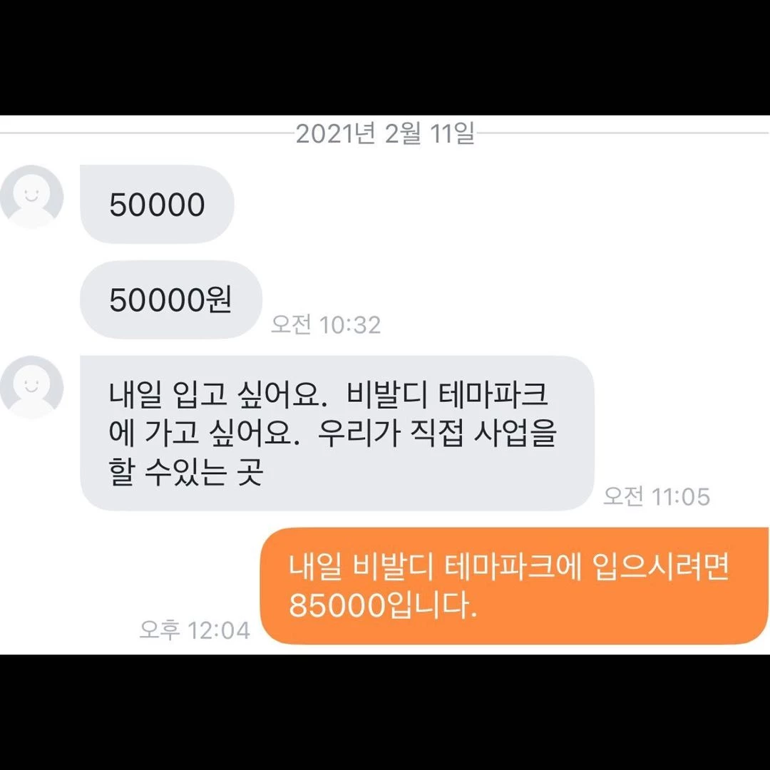 그러자 A씨는 5만원을 제시하며 "내일 입고 싶어요. 비발디 테마파크에 가고 싶어요. 우리가 직접 사업을 할 수 있는 곳"이라고 흥정을 시작했다.