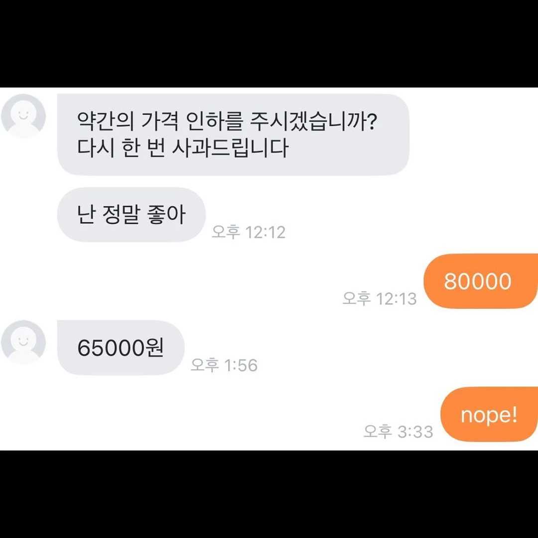A씨는 "약간의 가격 인하를 주시겠습니까? 다시 한번 사과드립니다. 난 정말 좋아"라고 재차 흥정을 요구했다.