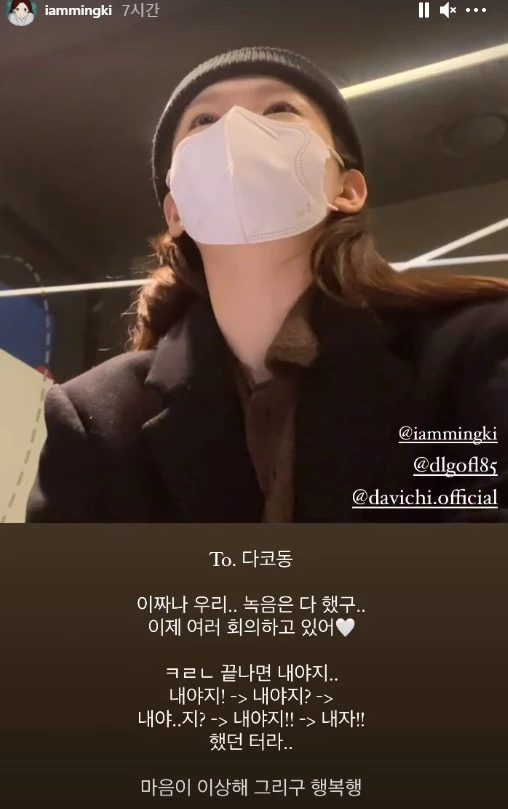 강민경은 18일 인스타그램 스토리를 통해 영상과 메시지를 공개했다. 마스크를 착용하고 있는 본인의 모습과 '다코동(팬클럽)' 멤버들에게 남긴 글이 담겼다. 새 앨범에 대한 예고였다.