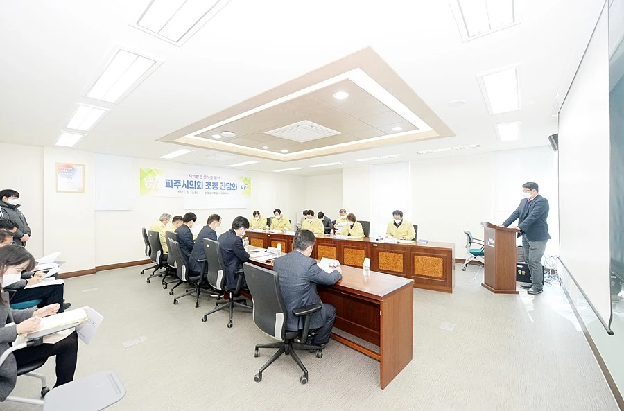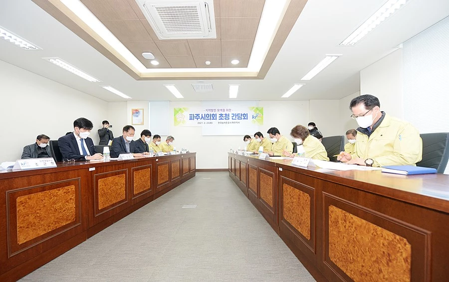 이번 간담회는 파주시의회 한양수 의장, 이용욱 도시산업위원장을 비롯한 7명의 의원과 한국농어촌공사 파주지사장 및 관계자 등 11명이 참석했으며, 철저한 방역 조치 후 회의를 진행했다.