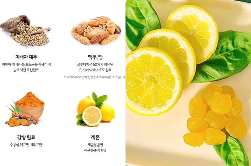 마이니 굿모닝 구미는 효모추출물, 미배아대두발효추출분말, 네오큐민(강황추출분말)을 넣고 레몬농축액으로 상큼함을 더한 숙취해소용 젤리다.