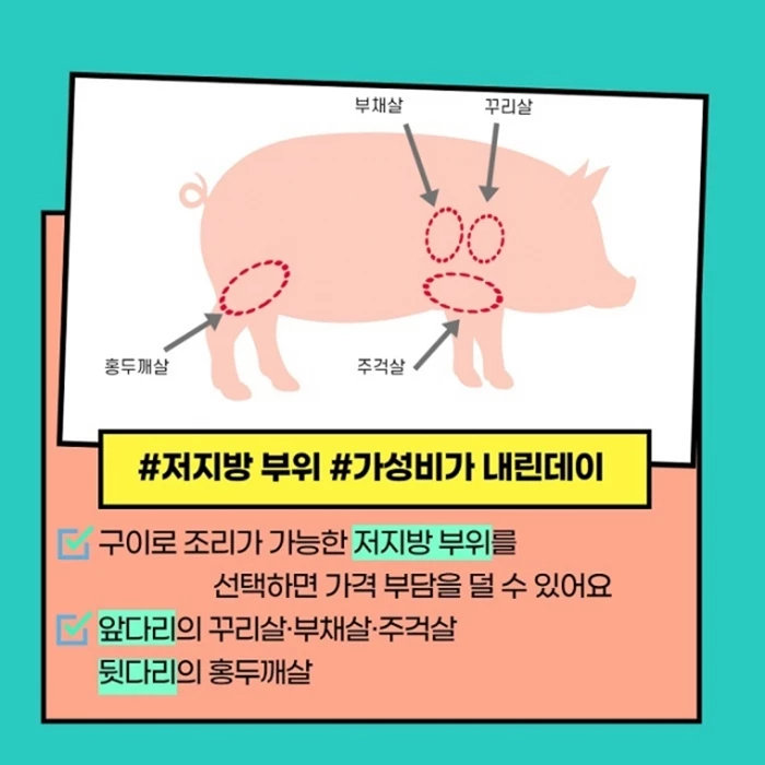 대한민국 국민 1인당 연간 돼지고기 평균 소비량은 용도별로 구이용이 10.44kg(46.2%)으로 가장 많았고 불고기·주물럭 5.43kg(24.0%), 수육·보쌈 3.64kg(16.1%) 등이 뒤를 따랐다. 선호하는 구이용 부위로는 삼겹살과 목심이 뽑혔다. 국립축산과학원은 삼겹살, 목심만큼 맛있으며 가격도 저렴한 부위를 발굴해 소개했다.