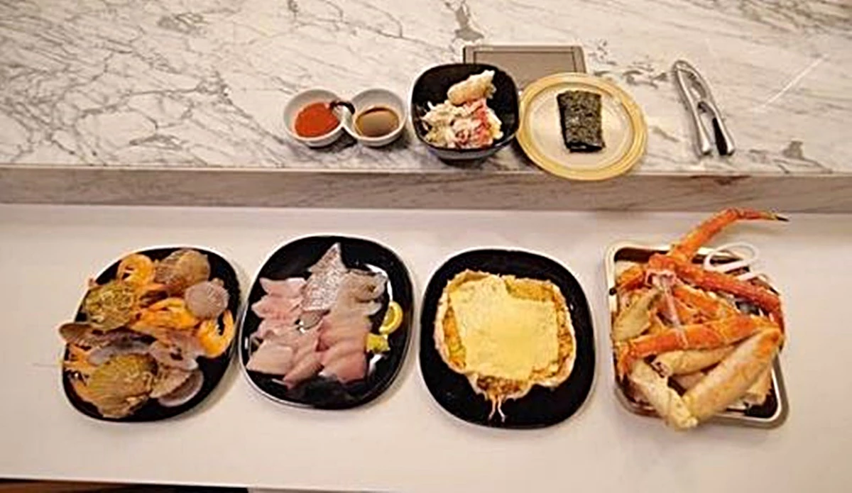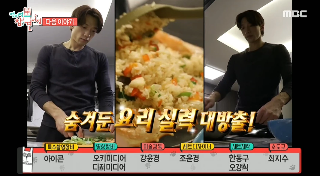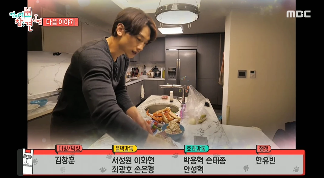 이때 비의 집 주방이 보였다. 널찍한 조리 테이블과 다양한 도구들이 눈에 띄었다. 비는 혼자서 대게를 손질해 치즈 게살볶음밥을 만들었다. 대게찜, 생선회도 차렸다.