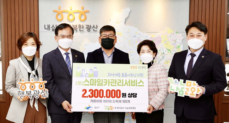 ㈜스마일카관리서비스가 9일 홀몸어르신을 위해 써달라며 분사형 소독제 100개(50만원 상당), 겨울이불 100채(180만원 상당)를 광주시 광산구청장실에서 투게더광산나눔문화재단에 기탁했다.