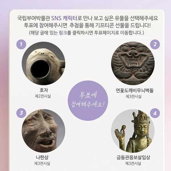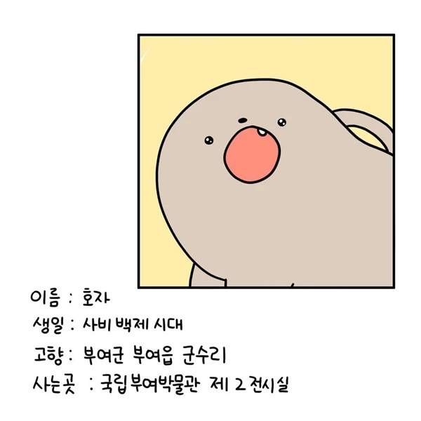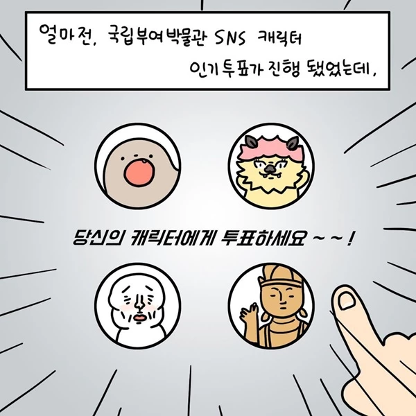 당시 박물관은 SNS에 캐릭터들의 모습을 공개했다. 이 캐릭터들은 전부 국립부여박물관이 소장하고 있는 백제 시대 유물들에서 모습을 따온 것이다. 캐릭터로 만들어진 유물들은 각각 호자, 연꽃 도깨비 무늬 벽돌, 나한상, 금동관음보살입상 등 4점이다.