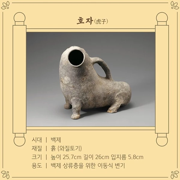 호자는 3세기 말~4세기 초 백제 시대 귀족들이 사용한 일종의 이동식 변기다. 편하게 요강이라고 생각할 수도 있겠다. 재질은 흙으로 빚어 가마에 구운 ‘와질토기’로 돼 있으며 물통으로 사용했다는 의견도 일부 존재하나 학계에서는 변기일 가능성이 높다 여기고 있다.