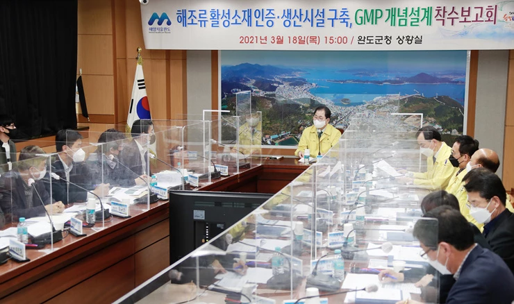 완도군은 지난 18일 군청 상황실에서 ‘해조류 활성소재 인증·생산시설 구축’을 위한 우수건강기능식품제조기준(GMP) 개념설계 용역 착수보고회를 개최했다.