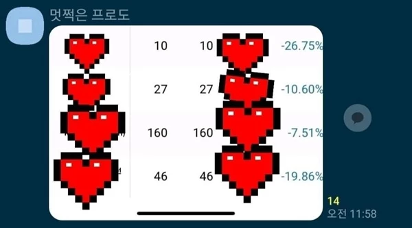 문제는 사진에 보이는 네 종목 모두 떨어진 수익률을 뜻하는 ‘파란색’이라는 점이다. 네 개의 종목은 각각 -26.75%, -10.60%, -7.51%, -19.86%라는 처참한 수익률을 보여주고 있었다.