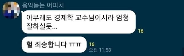 교수가 올린 사진을 미처 못 본 다른 학생은 “아무래도 경제학 교수님이라 엄청 잘하실 듯”이라고 말을 꺼냈다가 재빨리 “헐 죄송합니다”라고 사과했다. 이에 교수는 짧고 굵은 말로 모든 심경을 표현했다.