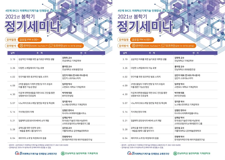 전남대학교 4단계 BK21 미래혁신기계기술 인재양성 교육연구단(단장 정승훈 교수·기계공학부)이 오는 3월 19일부터 6월 4일까지 10차례에 걸쳐 「2021년 봄학기 정기세미나」를 진행한다.