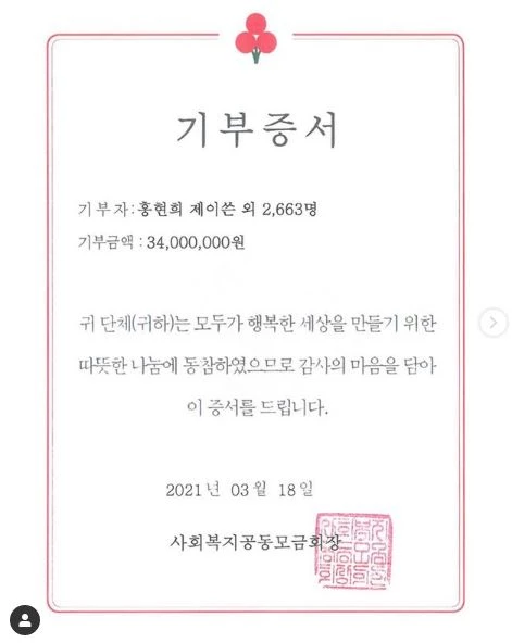 제이쓴은 "개인 소장으로 제작했던 그립톡에 많은 이들이 판매 요청을 해주셨다"며 "혼자서는 막막했지만, 아이버스터와 개그맨 하준수, 웹툰 작가 젬툰을 비롯한 많은 분이 함께해줘서 3400만 원을 기부할 수 있었다"고 오히려 동료들에게 고마움을 전했다.