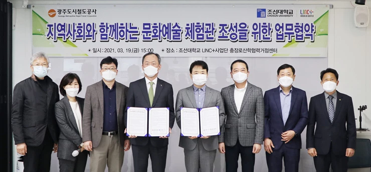 조선대학교 LINC+사업단은 3월 19일 오후 3시 충장로 산학협력거점센터에서 광주도시철도공사와 문화예술체험 및 다양한 콘텐츠 운영을 위한 업무협약을 체결했다.