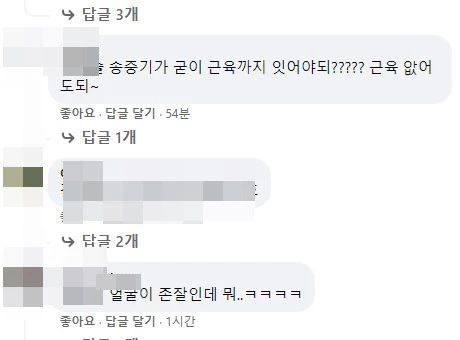 해당 글을 본 네티즌들은 "근육이 없어도 얼굴이 있잖아", "송중기 얼굴에 근육까지 있어야 되냐", "얼굴이 존잘인데 뭐…"라며 댓글을 남겼다.