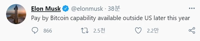 일론 머스크 테슬라 CEO는 24일 자신의 트위터에 "이제부터 테슬라를 비트코인으로 살 수 있습니다"라고 밝혔다. 이어 "올해 안에 미국 외 지역에서도 가능하게 할 것"이라고 썼다.