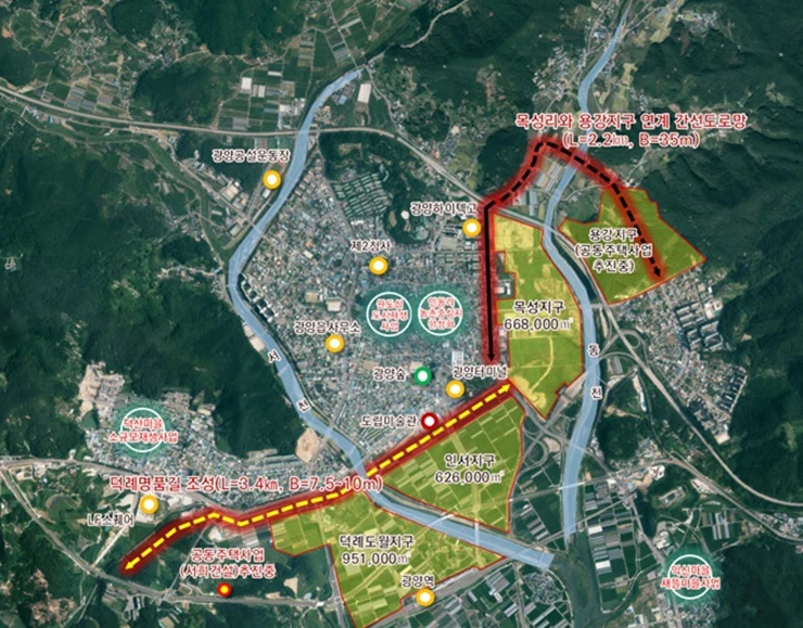 광양시는 광양읍 원도심에 추진 중인 5건의 도심재생사업(광양읍 도시재생사업(읍내리, 인서리 일원), 광양읍 농촌중심지 활성화사업(인동리 일원), 덕산마을 소규모 재생사업, 익신마을 새뜰마을사업)을 통해 광양읍 생활권이 하나로 연결될 것으로 보고 있다.