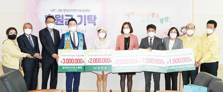 (재)광양시어린이보육재단에 따뜻한 마음을 나누는 후원의 손길이 각종 사회단체, 시민들의 적극적인 동참으로 이어지고 있다.