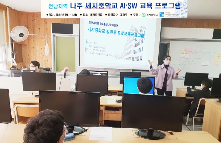 호남 최초 소프트웨어 중심대학인 조선대학교 SW중심대학사업단이 나주 세지중학교에서 ‘2021년 전남지역 중학교 AI·SW교육프로그램’을 시작했다.