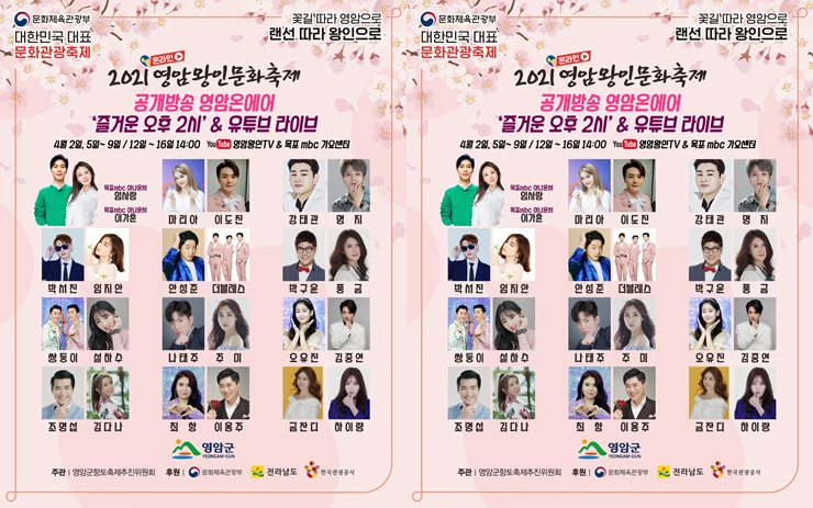 한편, 2021 온라인 영암왕인문화축제는 유튜버 창현의 거리노래방을 오는 3일 토요일 오후 2시부터 5시까지‘영암왕인TV’를 통해 실시간 라이브 방송할 예정이며, 유튜버 한나의 영암 아틀리에 10선을 4월 1일부터 오는 11일까지 오후 1시부터 30분간 ‘영암왕인TV’를 통해 공개한다. 그리고 유튜버 정호영 셰프의‘기찬영암 푸드쇼’를 오는 4일 일요일 오후 2시부터 3시까지 라이브로 진행한다.