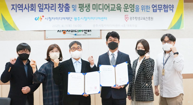 (재)광주평생교육진흥원(이하 ‘진흥원’)이 광주시청자미디어센터(이하 ‘센터’)와 1일 지역사회 일자리 창출 및 평생 미디어교육 운영 등에 공동 협력하기 위해 업무협약을 체결했다.