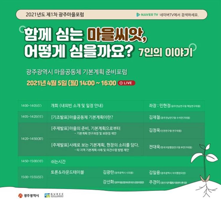 포럼은 ‘함께 심는 마을씨앗, 어떻게 심을까요? 7인의 이야기’를 부제로 진행되며 온라인(네이버TV)으로 중계되며, 실시간 의견수렴 및 다시보기도 가능하다.