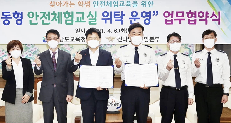 전남도교육청은 6일 청사 5층 비즈니스실에서 전라남도소방본부와‘이동형 안전체험교실 위탁운영’ 협약을 체결한 뒤 안전체험차량 시연회를 열었다.