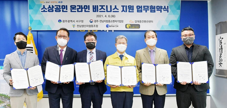 광주시 서구(구청장 서대석)가 6일 광주·전남중기청, 김대중컨벤션센터, 전남생산자협동조합, 셀러24, ㈜인필과 코로나19로 어려움을 겪고 있는 소상공인에게 온라인 판로개척 및 매출 활성화 지원을 위한 소상공인 온라인 비즈니스 지원사업 업무협약을 체결했다.