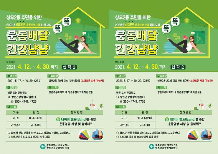 광주 서구(구청장 서대석)가 상무2동 및 인근 지역주민을 위한 모바일 기반 비대면 운동프로그램인 ‘똑똑! 운동배달 건강냠냠’ 참여자를 오는 30일까지 선착순 모집한다.